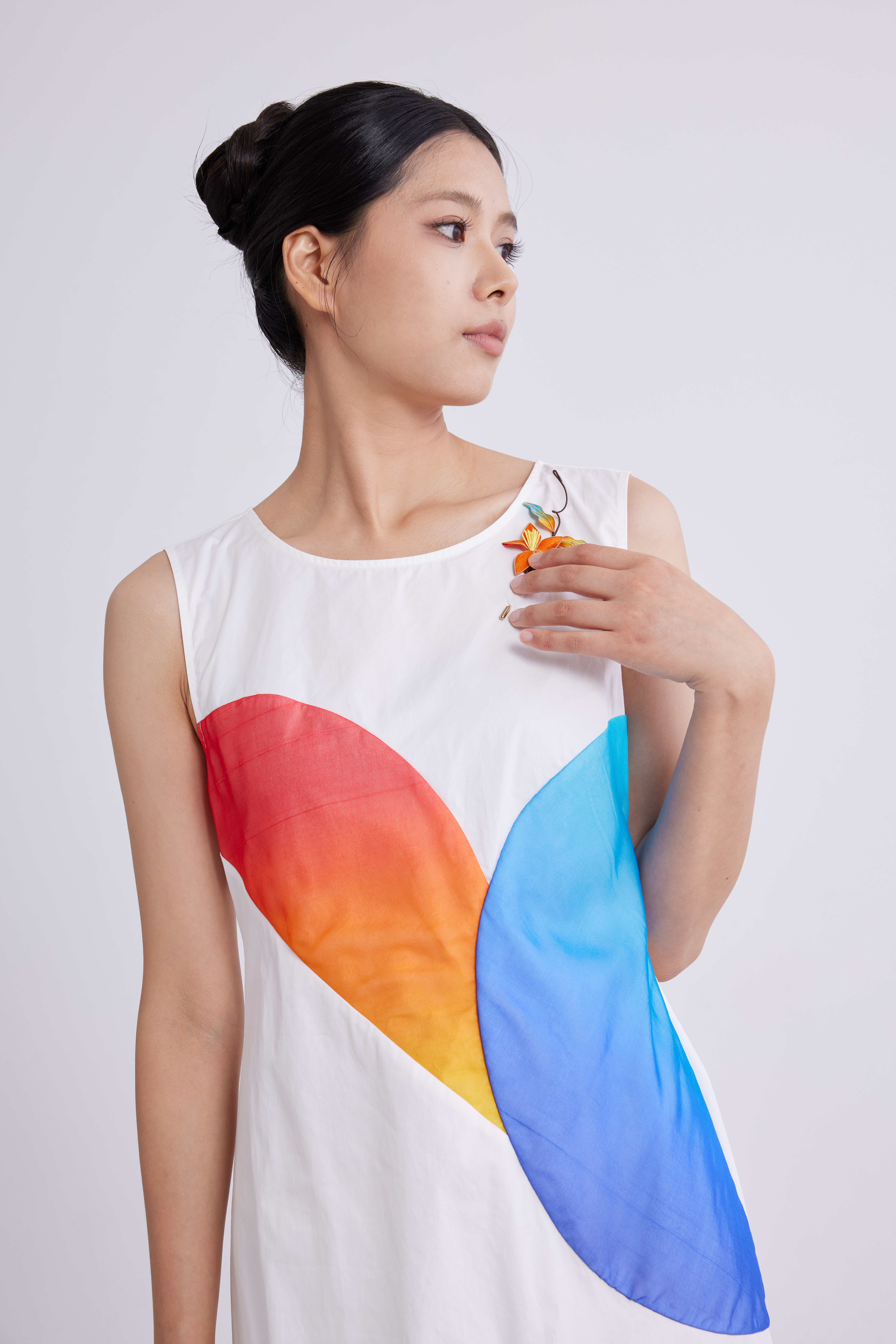 别针装饰白连衣裙